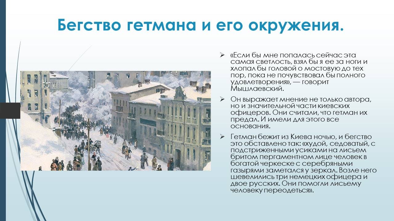 «Если бы мне попалась сейчас эта самая светлость, взял бы я ее за ноги и хлопал бы головой о мостовую до тех пор, пока не почувствовал бы полного удовлетворения», — говорит Мышлаевский. Он выражает мнение не только автора, но и значительной части киевских офицеров. Они считали, что гетман их предал. И имели для этого все основания. Гетман бежит из Киева ночью, и бегство это обставлено так: «худой, седоватый, с подстриженными усиками на лисьем бритом пергаментном лице человек в богатой черкеске с серебряными газырями заметался у зеркал. Возле него шевелились три немецких офицера и двое русских. Они помогли лисьему человеку переодеться. Была совлечена черкеска, широкие шаровары, лакированные сапоги. Человека облекли в форму германского майора, и он стал не хуже и не лучше сотен других майоров. Затем дверь отворилась, раздвинулись пыльные дворцовые портьеры и пропустили еще одного человека в форме военного врача германской армии. Он принес с собой целую груду пакетов, вскрыл их и наглухо умелыми руками забинтовал голову новорожденного германского майора так, что остался видным лишь правый лисий глаз, да тонкий рот, чуть приоткрывший золотые и платиновые коронки».