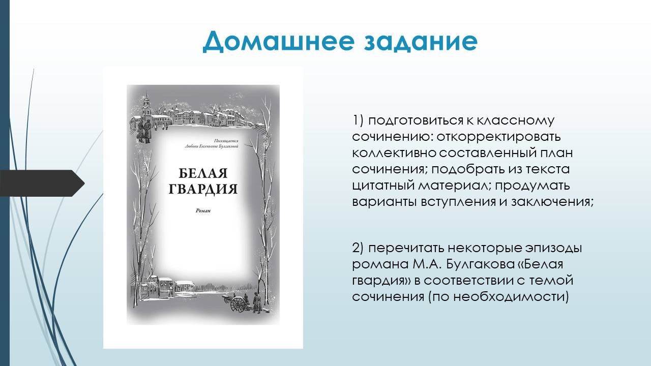 - перечитать некоторые эпизоды романа М.А.Булгакова «Белая гвардия» в соответствии с темой сочинения (по необходимости).
