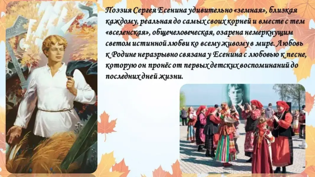 Презентация к литературно-музыкальной гостиной «О Русь, покойный уголок, Тебя люблю, тебе и верую.…» (к 130-летию со дня рождения С.А.Есенина)