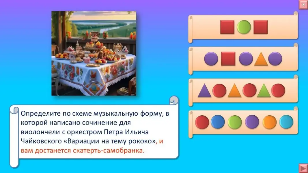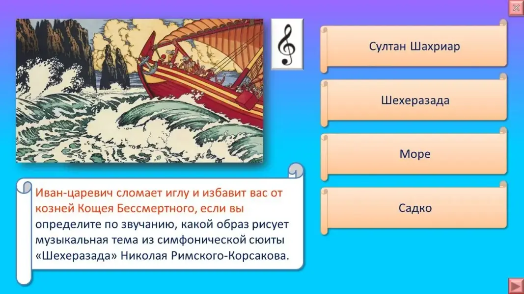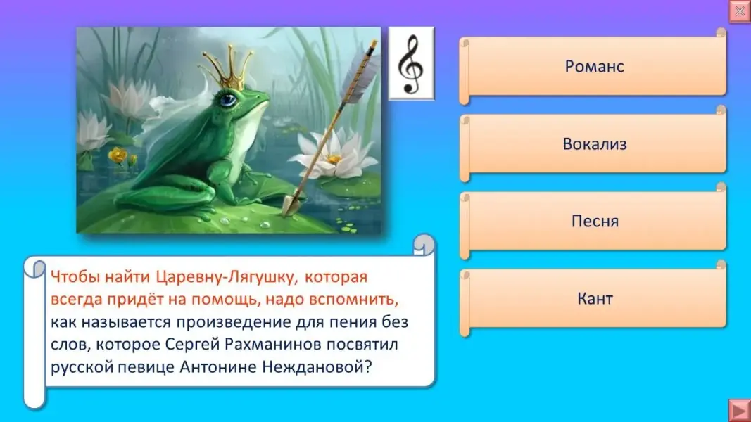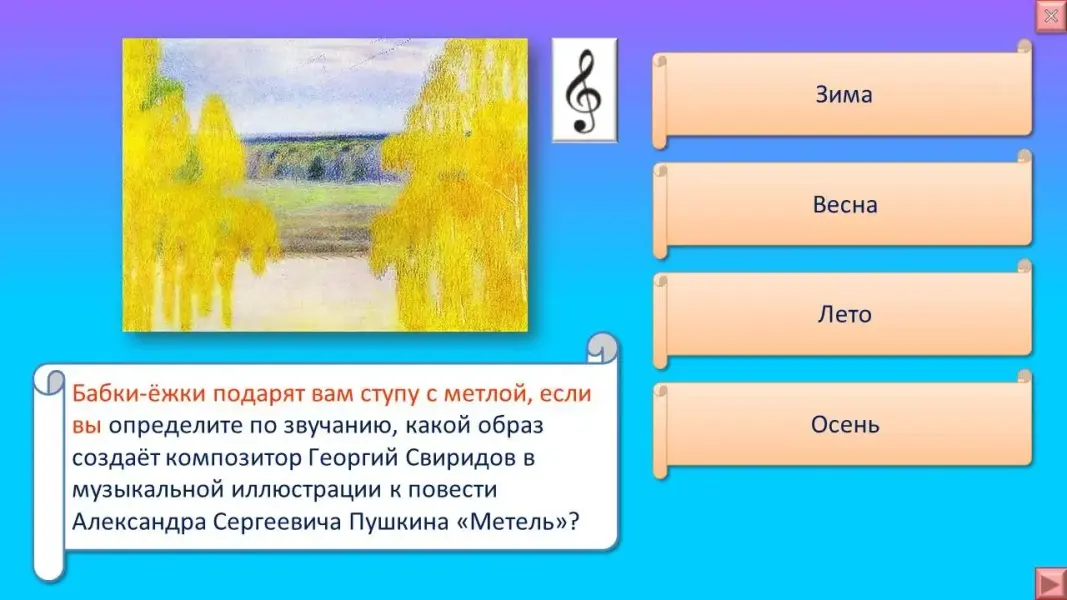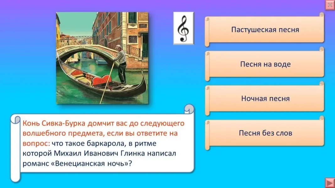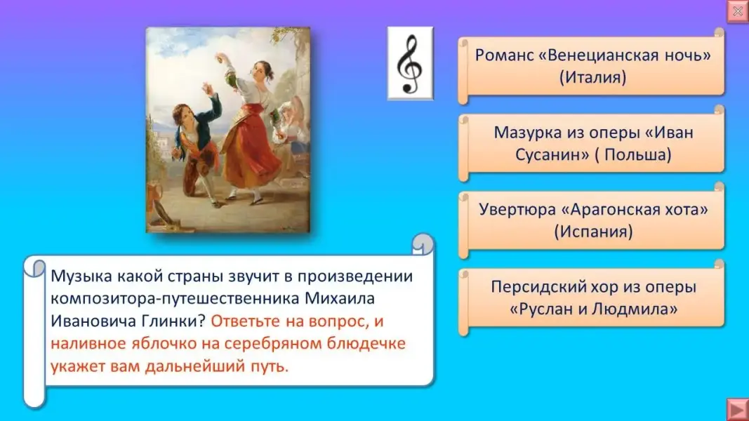 Игра предназначена для закрепления нескольких тем учебного материала по музыке по окончании 4-го класса общеобразовательного учреждения. В содержание игры включены вопросы, связанные с определением на слух произведений, их авторов, музыкальных образов, формы, исполнительского состава, жанров. Музыкальный материал представлен русской народной музыкой и произведениями отечественных композиторов. Для проведения игры создана интерактивная презентация.