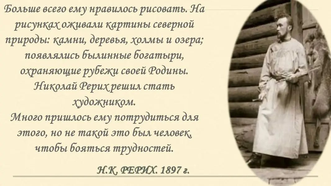 Но больше всего ему нравилось рисовать. На рисунках оживали картины северной природы: камни, деревья, холмы и озера; появлялись былинные богатыри, охраняющие рубежи своей Родины. Николай Рерих решил стать художником.
