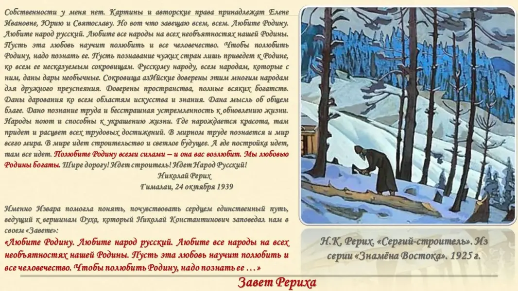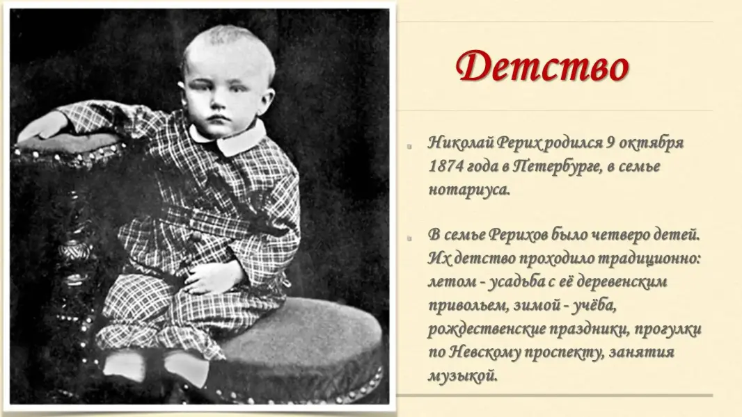 Мой рассказ об одном из них- великом русском художнике Николае Константиновиче Рерихе. За свою жизнь он создал тысячи картин, которые разошлись по всему миру и подарили людям радость и красоту. В детстве Николай Рерих был любознательным мальчиком. С интересом наблюдал он за родной природой.