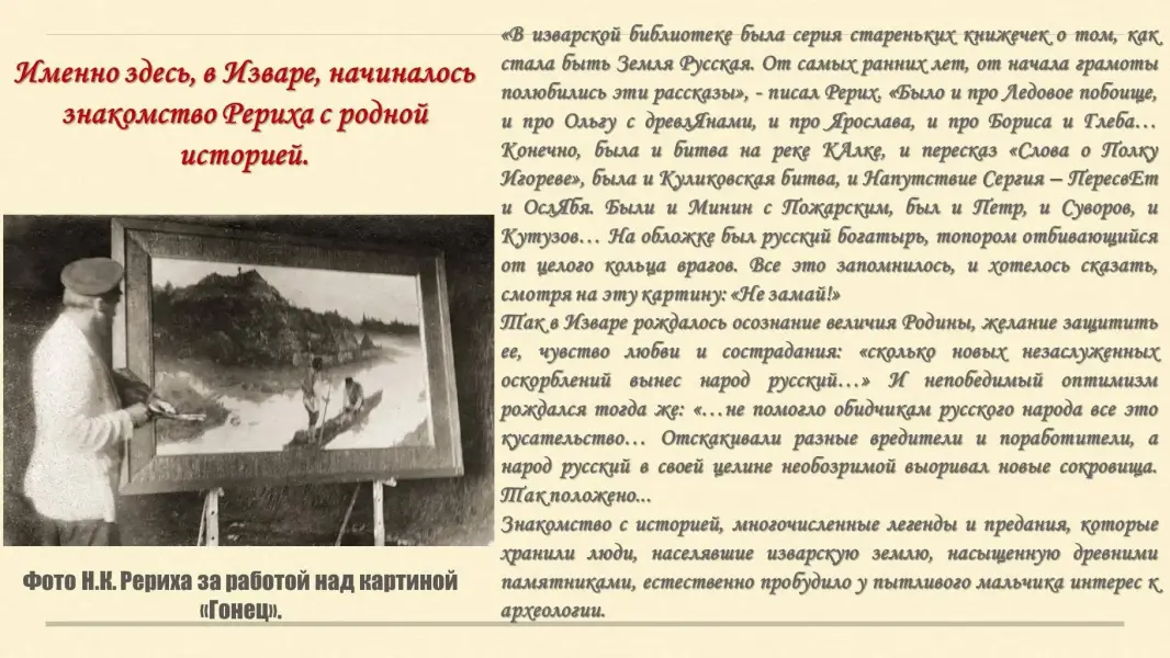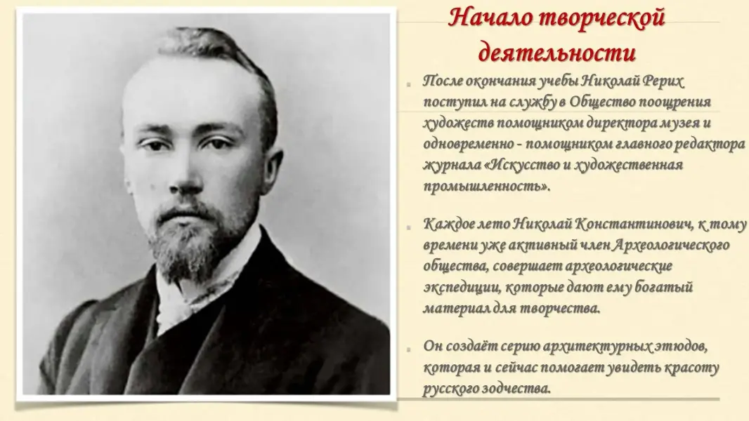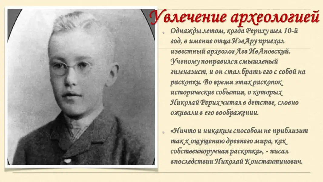 Николай Рерих серьезно увлекается археологией: читает книги по истории, сам проводит раскопки в окрестностях имения своей семьи, делает зарисовки древних курганов, записывает народные легенды, былины, предания./