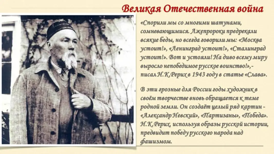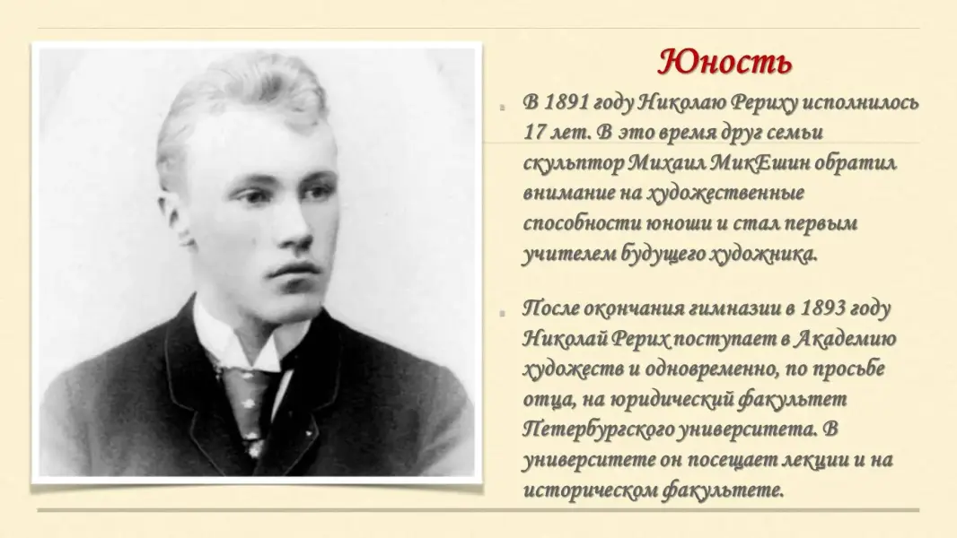 (В годы обучения в университете Николай Рерих познакомился с человеком, оказавшим большое влияние на его научную и общественную деятельность и сыгравшим важную роль в становлении его мировоззрения. Это был Владимир Васильевич Стасов - образованнейший человек своего времени, известный литературный, художественный и музыкальный критик, большой знаток в различных областях искусства, литературы и истории, популяризатор русской культуры).