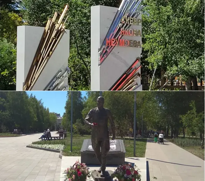 Учитель: недалеко от нашей школы расположен красивый сквер, который носит имя Героя Советского Союза - Якова Николаевича Неумоева. Что вам известно об этом человеке? Почему его именем назван целый сквер? (ответы учащихся, ролителей)