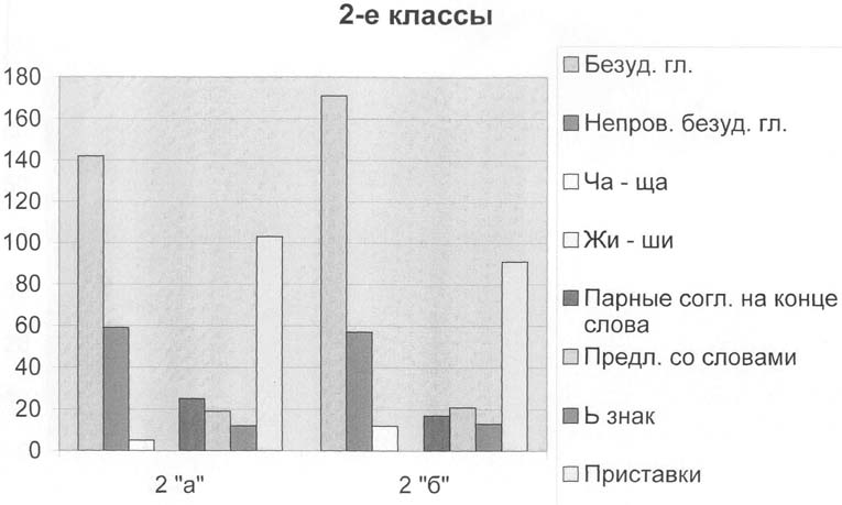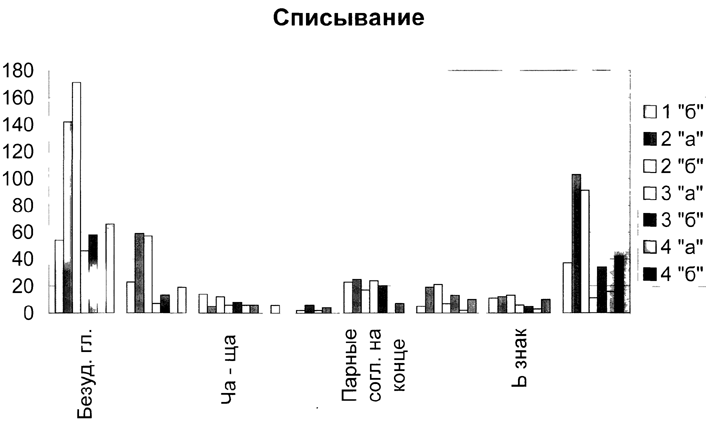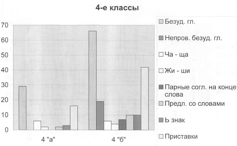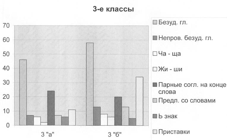 Таким образом, во всех тестируемых классах школьники не смогли выделить все орфограммы на "Правописание безударных гласных проверяемых ударением" - это показывает, что она является одной из наиболее сложных орфограмм в начальном обучении. Поэтому необходимо целенаправленно планировать работу по умению видеть данную орфограмму. Результаты, полученные в ходе анализа списывания отображены на диаграммах (Приложение № 6).