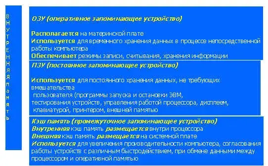 - Для ускорения работы компьютера используется внутренняя память, созданная для быстрого доступа