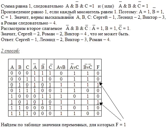 2 способ: составим таблицу истинности, найдем по таблице значения переменных, для которых F = 1, проанализируем результаты.