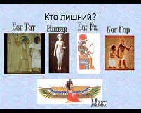 Учитель истории: И так, снова смотрим на экран. Боги какой страны изображены на экране и кто из них "лишний"?