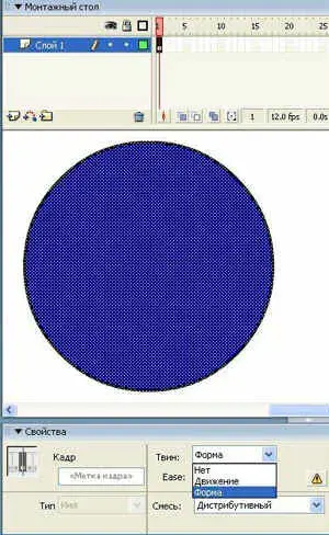 3. Выделите ключевой кадр и выберите на панели Свойства - Твин - Форма. <Рисунок10>