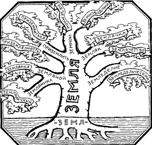 Учитель. Хорошо, и с этим заданием все справились. Наше путешествие подходит к концу. Мы побывали во многих населенных пунктах страны Словообразование, познакомились с ее достопримечательностями. Жители лингвистической страны хотели бы познакомить вас еще и с лесным богатством. Это лес, который называется Деревья слов. Здесь сажает дерево каждый, кто побывает в стране Словообразование. Вас тоже просят посадить деревья в память о том, что вы побывали в этой прекрасной стране.