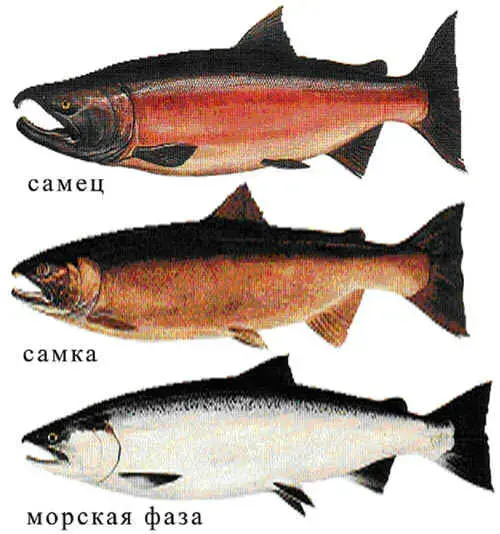 Давайте рассмотрим рисунки с кижучем. Как видите здесь представлены самка и самец в брачном наряде, а также океаническая (морская) фаза.