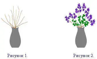 И вот чудо: веник зацвёл. Прутики покрылись маленькими светло-лиловыми цветами, похожими на фиалки. А из набухших почек-узелков прорезались листья светло-зелёные, ложечкой.)