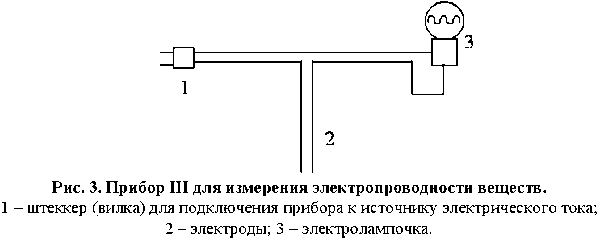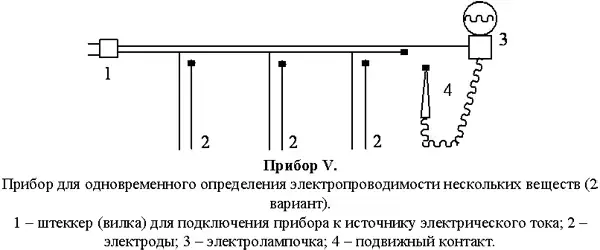 3. При отсутствии светодиода можно воспользоваться в качестве индикатора электрической проводимости лампочкой на 6-12 вольт (прибор III) <Рисунок 3>. Лучший эффект наглядности могут дать приборы, позволяющие одновременно определять электропроводность нескольких веществ (растворов) - приборы IV <Рисунок 4>и V<Рисунок 5>.