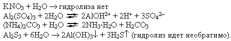 Опыт 8. Гидролиз солей. Растворите в стаканчиках небольшие порции нитрата калия, карбоната калия, сульфата алюминия, карбоната аммония, сульфида алюминия. Наблюдаются ли внешние изменения при растворении этих веществ? Определите с помощью универсальных индикаторных бумажек величину рН растворов и сделайте соответствующие выводы. Запишите уравнения реакций гидролиза, где они имеют место: