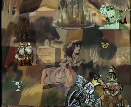 Надя Ш. "Алиса в зазеркалье". Хотела показать, что жизнь наша имеет две стороны. Одна сторона, в которой мы живем для себя, другая общественная, в которой есть свой кролик, кот, король с королевой, шалтай-болтай и т.д. и эти два мира разделены зеркалом, а в жизни у каждого человека есть своё зазеркалье.