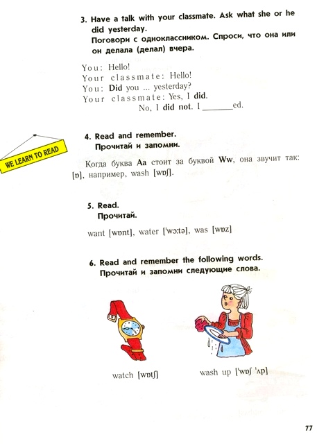 11. Знакомство с новым буквосочетанием. На доске ряд слов, содержащих буквосочетание WA. Слова want, wash знакомы по устной речи, поэтому догадаться о правильном звучании буквосочетания WA не сложно. Учащиеся подбирают из ряда предложенных знаков транскрипции необходимые для произношения. Закрепление чтения - упражнения 4,5,6 на странице. 77.