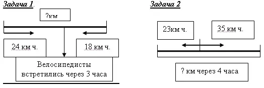 Вам надо самостоятельно решить две задачи. Условие задач на доске дано в виде схем, их в тетради делать не надо. Решаете задачи без пояснения. После того, как решите задачи, вы объясняете свое решение и оценивает друг друга. Обратите внимание на правильное применение словосочетаний "скорость сближения" и "скорость удаления".