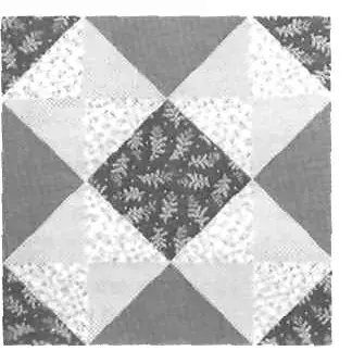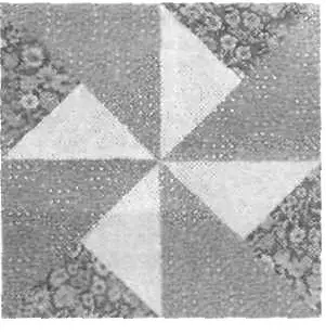 Мельница. Этот узор, в основе которого фрагмент из четырех лоскутов, достаточно прост и отлично подходит для начинающих. Он создается из четырех одинаковых частей, которые чередуются по кругу, формируя узор. Этот узор также известен под названием «О, Сюзанна». Вырежьте 4 светлых и 4 темных лоскута А, а также 4 лоскута В из ткани средней гаммы. Всего 12 лоскутов.