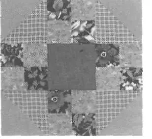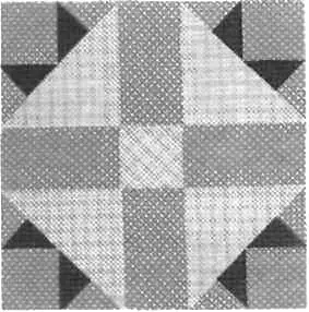 «Крест и корона». Является более сложным узором на основе фрагмента из девяти лоскутов, в котором 4 угловых лоскута разделены на части. Вырежьте 8 ярких и 8 темных лоскутов фигуры А, 4 лоскута фигуры В, 4 светлых лоскута фигуры С, 4 блестящих лоскута фигуры Б и I светлый лоскут фигуры Е -всего 29 лоскутов.