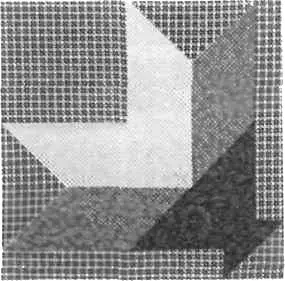 Старое Типпеканоэ. Этот узор состоит из лоскутов разнообразных форм. Если лоскут А принять за базовый квадрат, фигура В является его четвертью, а треугольная фигура С - его половиной. Вам понадобится один темный лоскут А, 8 светлых, 4 средних и 8 блестящих лоскутов В, а также 4 темных лоскутов С - всего 25 лоскутов.