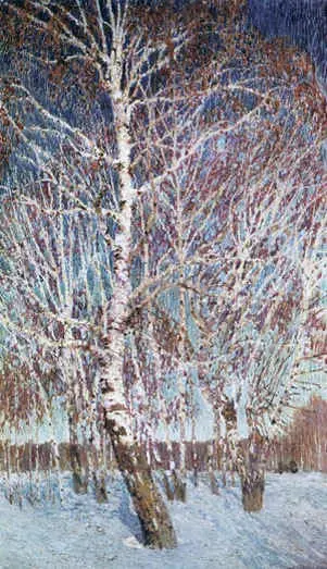 Молоденькие берёзки стоят по кругу, как прекрасные девушки, которые водят хоровод. Впереди красуется старшая берёза, она наряднее всех остальных деревьев. Её ствол розово-сиреневый, а верхушка желтоватая. Веточки берёзы похожи на жемчужное кружево. Тени берёз придают снегу голубовато-сиреневый оттенок, они словно играют друг с другом. Воздух чист и холоден, и мы как будто бы слышим хруст снега.
