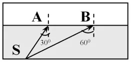 Предлагаю решить проблемную задачу: начертить дальнейший ход лучей, падающих в точки А и В от источника S, находящегося на дне сосуда, в который налита вода.
