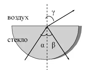 Переходя в оптически менее плотную среду, луч отклоняется от перпендикуляра в сторону границы двух сред. Учащиеся также замечают, что с увеличением угла падения яркость (энергия отраженного пучка) растет, а преломленного падает.