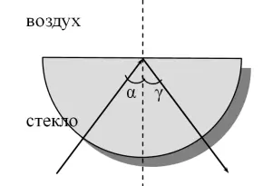 Осветитель поместим в нижней части диска. Кроме падающего луча, в стекле существует и отраженный луч. Его след можно заметить на матовой поверхности полуцилиндра. Отражение луча происходит в соответствии с законом отражения света.