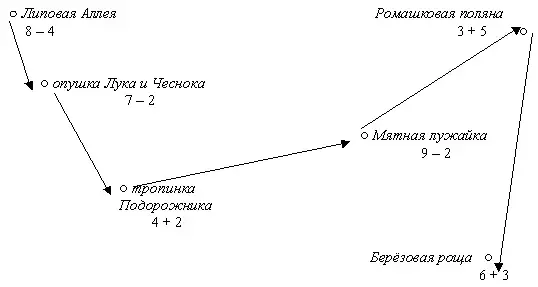 - А теперь давайте выберем маршрут нашего путешествия. Перед вами схема сказочного леса, где растут Лекарственные растения. Даны названия различных уголков, а под ними - примеры. Нужно определить путь движения. Для этого необходимо решить примеры, а ответы записать в порядке возрастания. Начнём с решения примеров. Ответы запишите на 1 строчке клеток. Записываем через клетку.