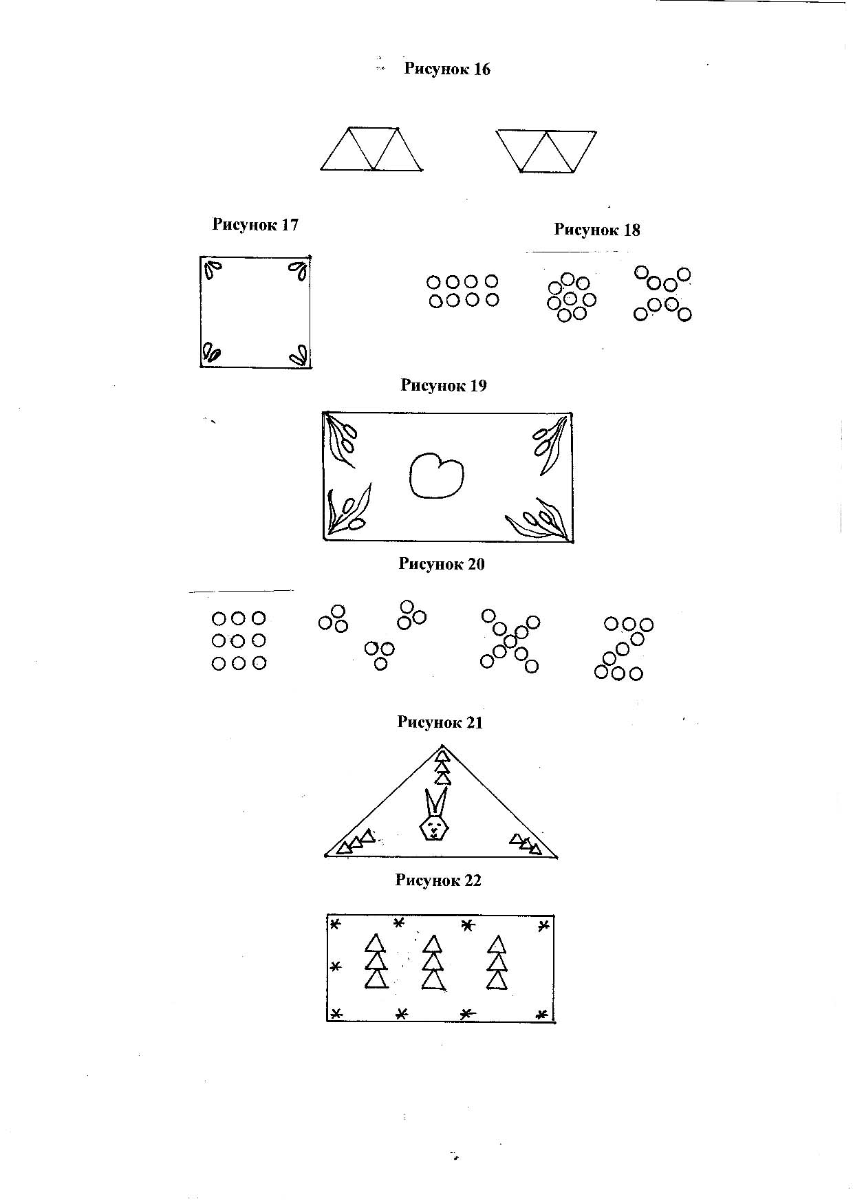 Составить узор на листах квадратной и треугольной формы из восьми семечек, выделяя углы. /Рис. 17/.