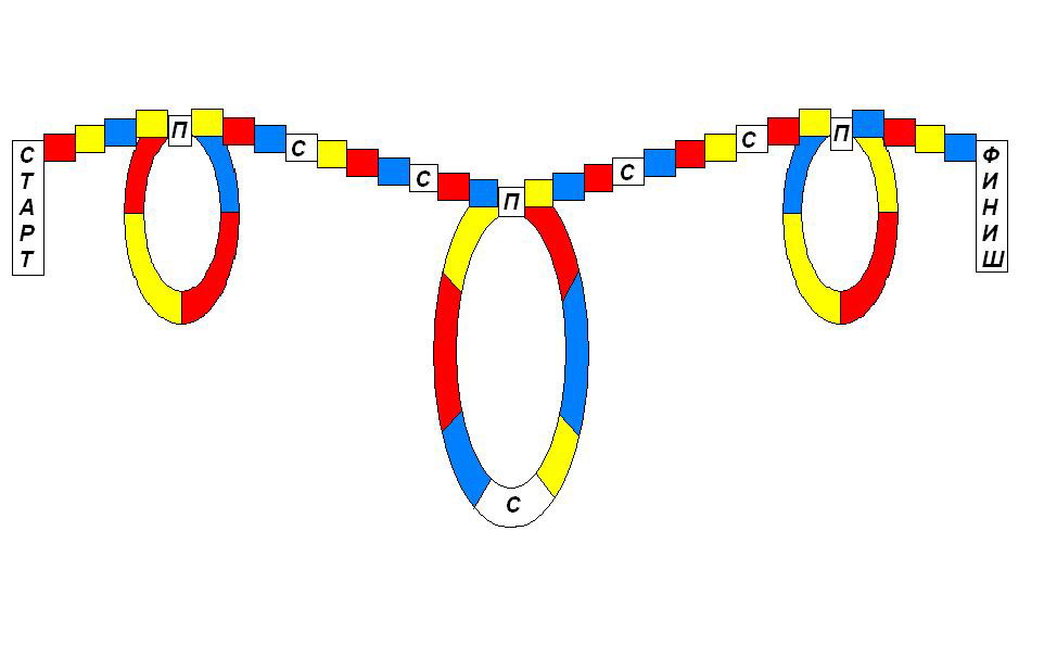 Оформление. На школьной доске чертится "Игровое поле" (рис 1), в виде дороги и условные обозначения. Дорога состоит из квадратов разного цвета, каждый из которых символизирует определённую область знаний. Красный квадрат - физика, жёлтый - химия, синий - география, С - сюрприз, П - перекрёсток.