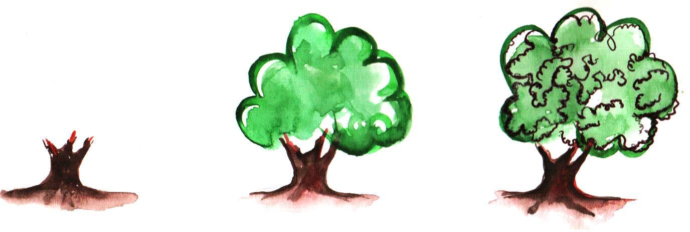 Используя зелёную акварель, провести волнистый контур кроны и закрасить её, оставляя небольшое количество маленьких пустот.