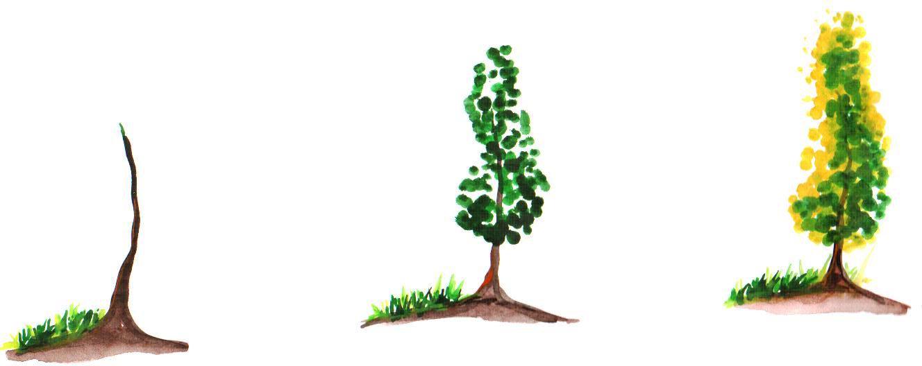 Используя зелёную акварельную краску, нарисовать три ствола дерева, сужающихся по направлению к верхушке, а потом землю.