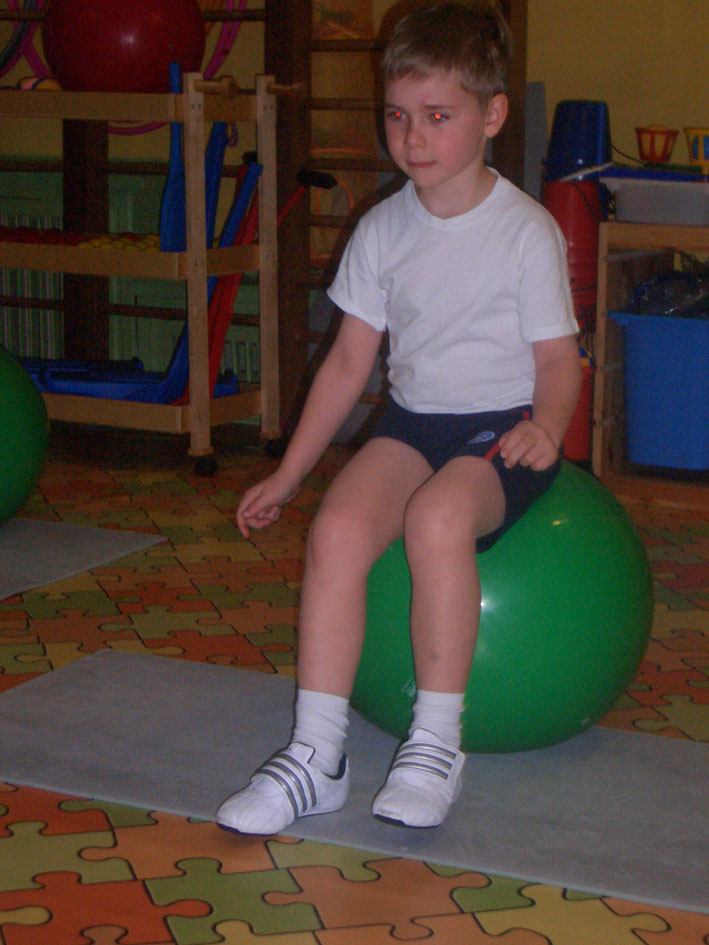 Выполняется сидя на мяче с пружинящими движениями. Разминка проводится под веселую детскую музыку. Во время разминки выполняются упражнения для всех основных групп мышц, начиная с головы и заканчивая ногами.