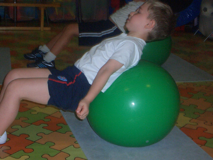 Выполняется в положении сидя на мяче, стоя, лёжа на мяче (на спине и животе), лёжа на коврике (на спине и животе).