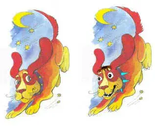 Д. (Большая, огромный рыжий хвост, огромнейшие зубы.)