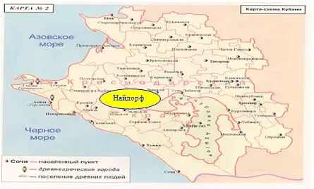 Ребята, перед вами карта-схема Кубани. Давайте отметим кружком место, где живем мы. п. Найдорф находится в конце Динского района, и граничит с Калининский районом.
