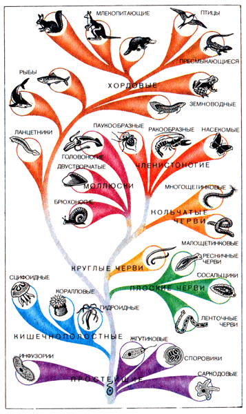 Найдите на схеме развития животного мира типы беспозвоночных животных и хордовых (классы рыб, земноводных, пресмыкающихся, птиц, млекопитающих). Объясните разницу в их различном расположении на схеме.