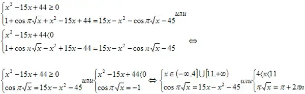 Решить уравнение первой система аналитически невозможно, исследуем поведение левой и правой частей на данных промежутках. Функция f(x) =-x2+15x-45=(-x2+15x-44)-1≤-1