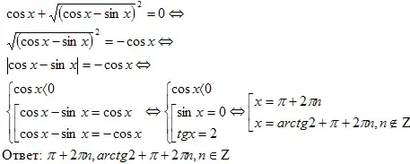 Решение. Левая часть уравнения неотрицательна, значит, неотрицательна и правая часть, тогда cosx <0, тогда уравнение равносильно системе