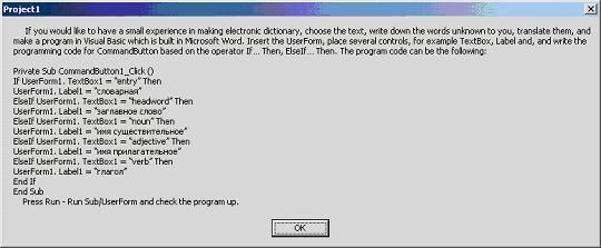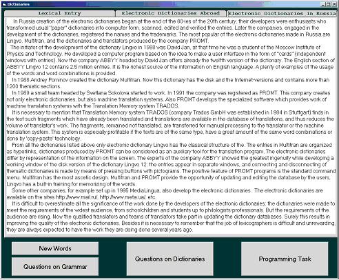 Целью данной статьи является описание программы, подготовленной в Visual Basic и предназначенной для работы с текстом, которая отчасти сходна с программами, которые можно подготовить с помощью Microsoft PowerPoint, но имеет элементы интерактивности - всплывающие по щелчку командных кнопок окна. В качестве содержательного наполнения использован составленный мной текст "Electronic Dictionaries". На мой взгляд, тема текста достаточно актуальна: студенты активно используют электронные словари разных типов. Текст состоит из трех смысловых частей: