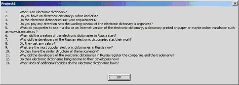 Рисунок 9. Окно, всплывающее по щелчку командной кнопки Questions on Dictionaries