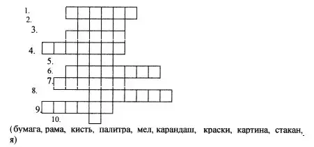 Учитель: Где работает художник? Сейчас мы решим кроссворд и узнаем. Я показываю предметы, а вы их называете. По выделенным буквам прочитаем слово.