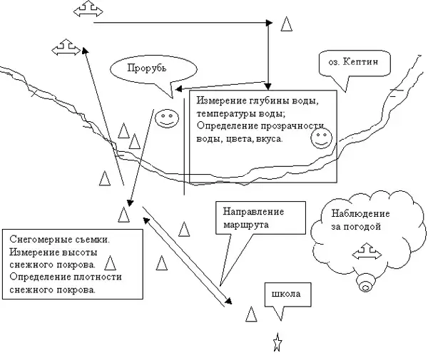 - измерение температуры воздуха. - измерение характеристик ветра: ( скорость, направление). Измерение глубины воды у проруби (см). Измерение температуры воды (дно, поверхность). Определение прозрачности воды. Определение цвета, вкуса воды. Отбор пробы воды на лабораторные анализы (бутылка от "Роса"). Подведение итога. Проверка работы, замечания, пожелания. |