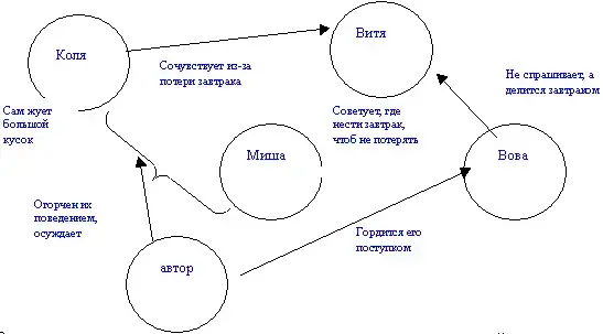 При анализе рассказов, основу которых составляет одно событие, раскрывающее жизненные позиции героев, я использую прием "словесного рисования", который позволяет воссоздать в воображении картину жизни, описанную автором, проникнуть в эмоциональную тональность произведения, понять позицию каждого героя. Для того чтобы детям было нагляднее видны изменения в характере героев, их взаимоотношения я использую схему - "система образов", предложенную В.А. Лазаревой. (Схема "Система образов" к рассказу В. Осеевой "Три товарища")
