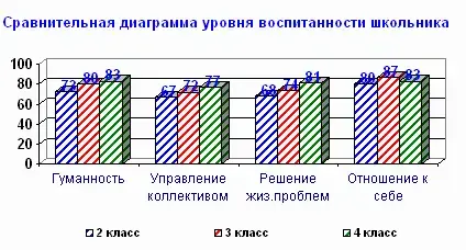 Из диаграммы видно, что учащиеся 4 класса больше внимания уделяют гуманным взаимоотношениям в коллективе, умеют управлять друг другом и подчиняться мнению большинства, решать жизненные проблемы; благодаря умению анализировать поступки героев художественных произведений, самооценка становится более строгой (процент ниже).