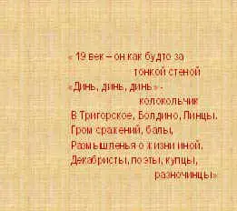 (о неразрывной взаимосвязи периодов исторического развития) - Выберите из нашего эпиграфа поэтические строки, которые могут стать темой нашего урока. ("XIX век он как будто за тонкой стеной…" тему урока записываем в тетрадь) |