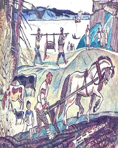 - Заглянем в прошлое и побываем в славянском поселении. Жили славяне небольшими поселками. Строили деревянные дома на высоком берегу реки и огораживали их со всех сторон высоким забором, чтобы враги не могли проникнуть туда. Все жители были заняты делом: кто пахал землю, кто ловил рыбу, кто пас скотину; женщины пряли и ткали лен, шили одежду.