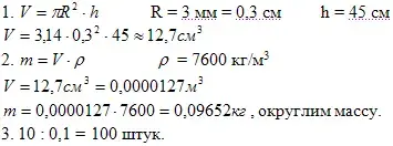 Сколько в связке электродов для электросварки если их общая масса 10 кг, а каждый электрод, кусок стальной проволоки длинной 45 см. и диаметром 6 мм. Плотность стали 7600 г/м3.